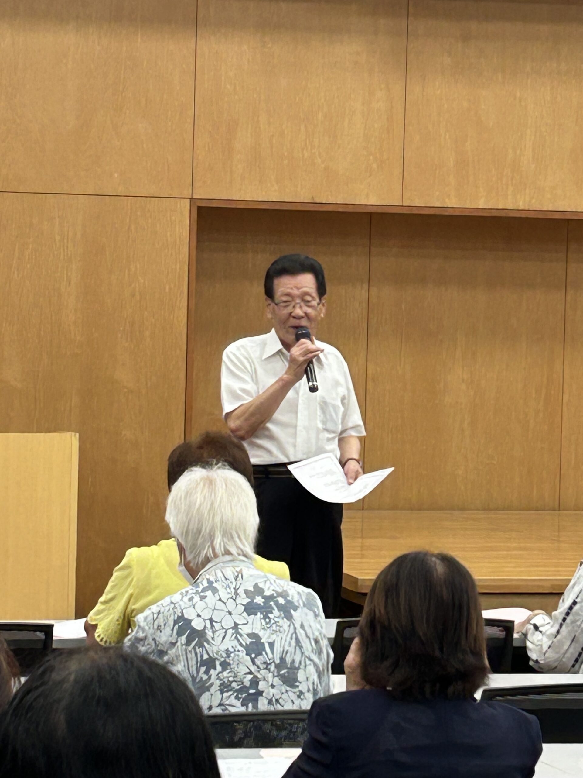 衛藤ヤス子市老連女性委員長、牧達夫市老連会長の挨拶の後、当会の松島主任が、老人クラブがめざす友愛活動について講話を行いました。