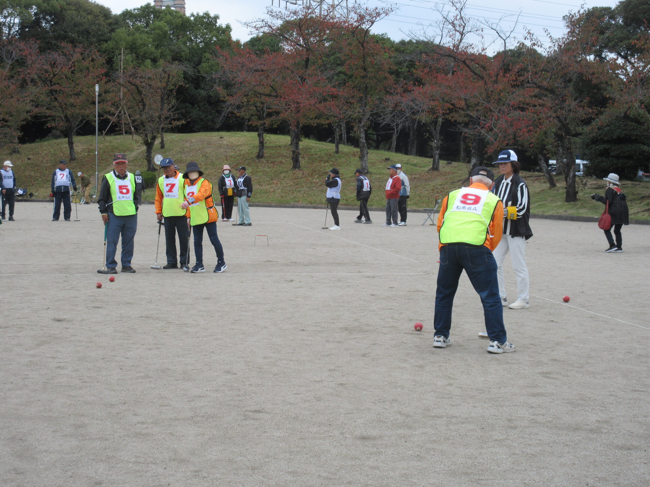 多少肌寒い気温ではありましたが、17市町から約350人が参加して、ゲートボール、グラウンド・ゴルフ、ペタンクの3競技に日頃の練習成果を発揮して、真剣に楽しく取り組んでいました。